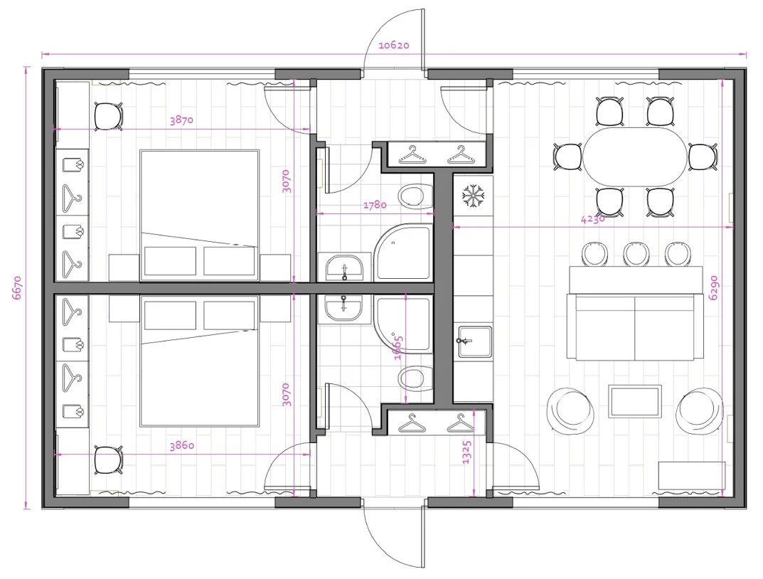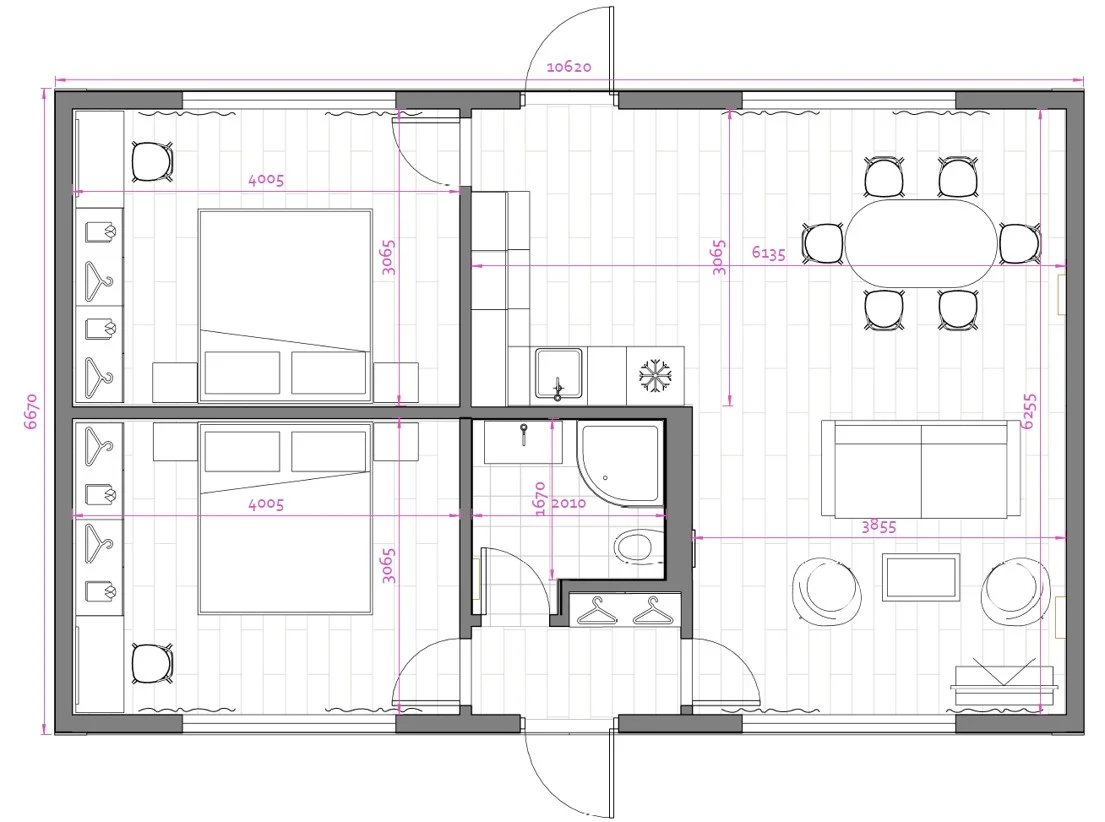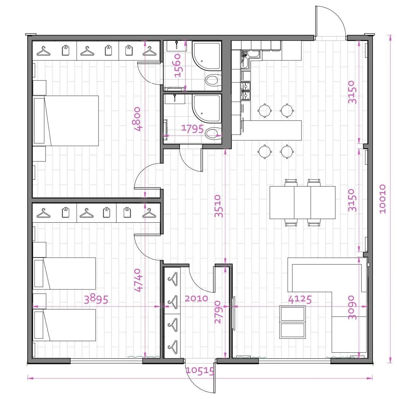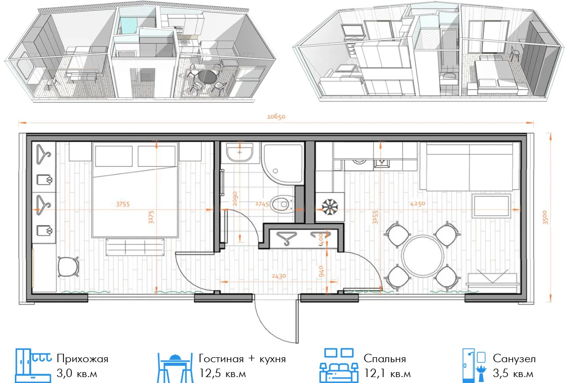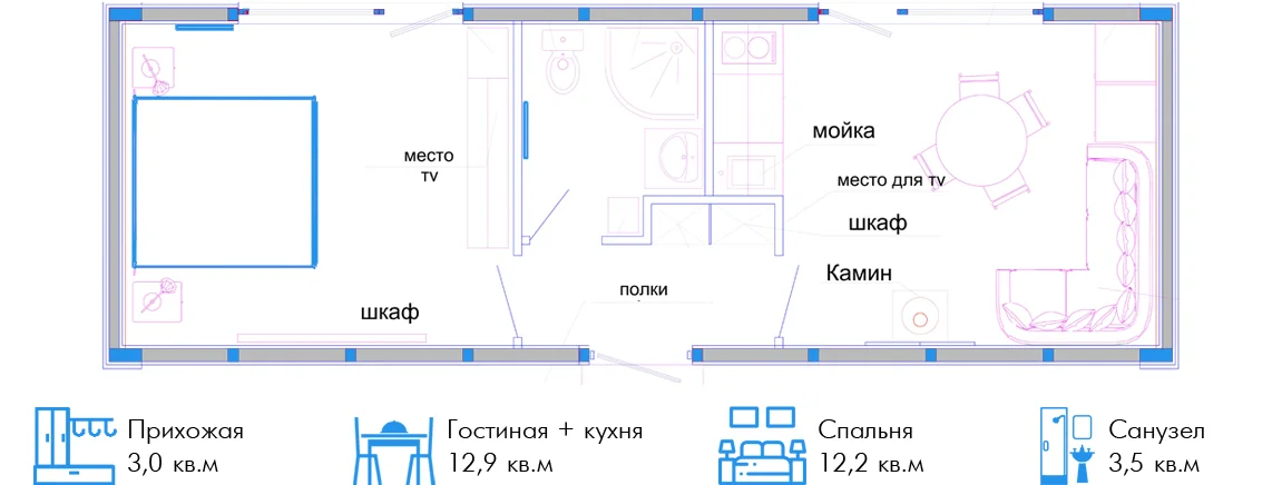 - Конечно, можете. Вы можете выбрать любую планировку внутреннего пространства дома. А в случае сборки и монтажа на вашем участке возможно увеличение ширины модуля до 4,2м.
